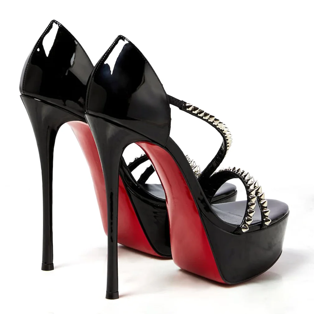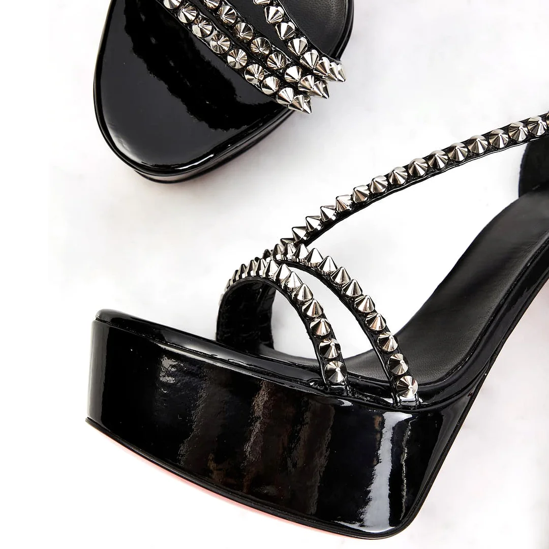 *This platforms sandals have patent leather uppers, spike-studded straps, and towering platform soles. This pair is finished with the red lacquered soles for unparalleled sophistication.