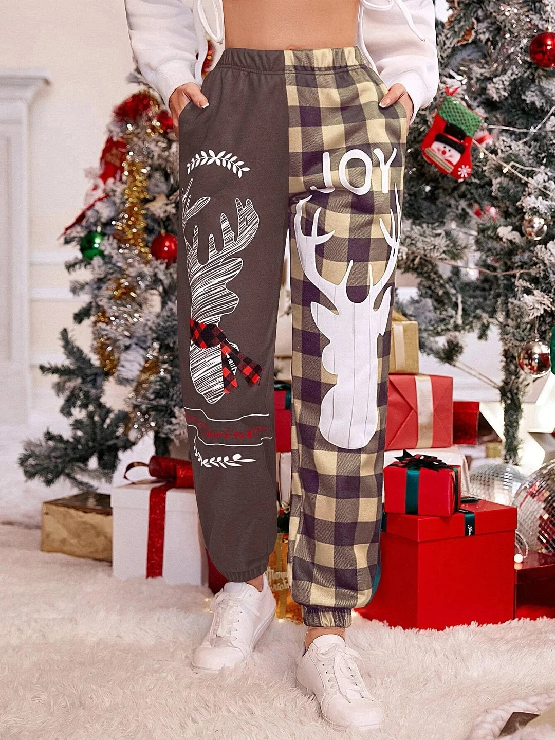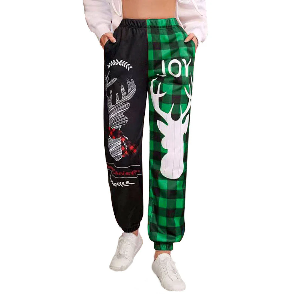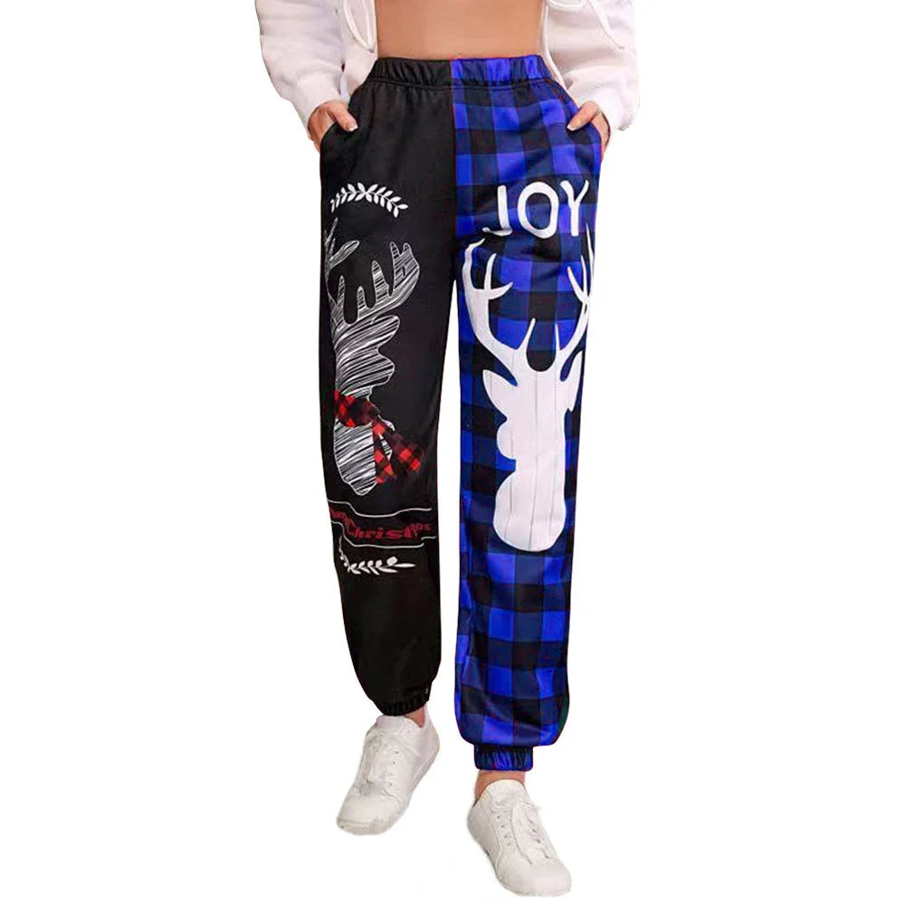 Christmas Deer Printed Pocket Color Contrast Pants