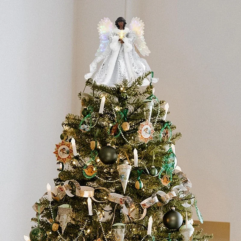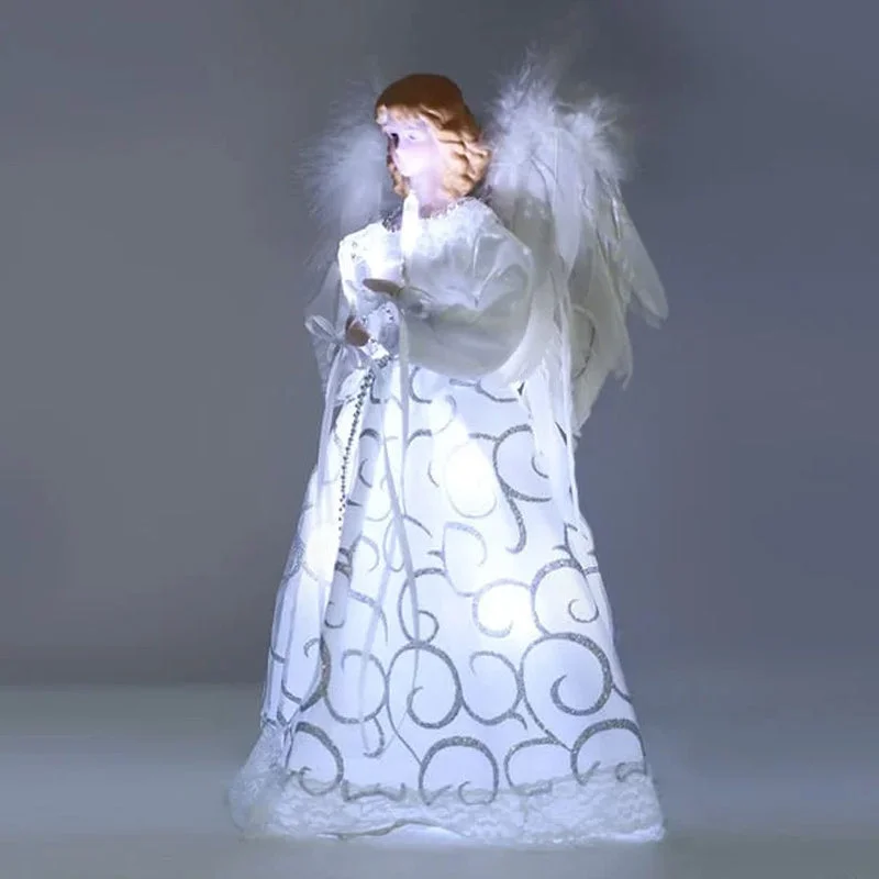- The Angels animated wings are pre-lit with colorful fiber optic illumination, and she holds a warm white star that shines bright in her hands.