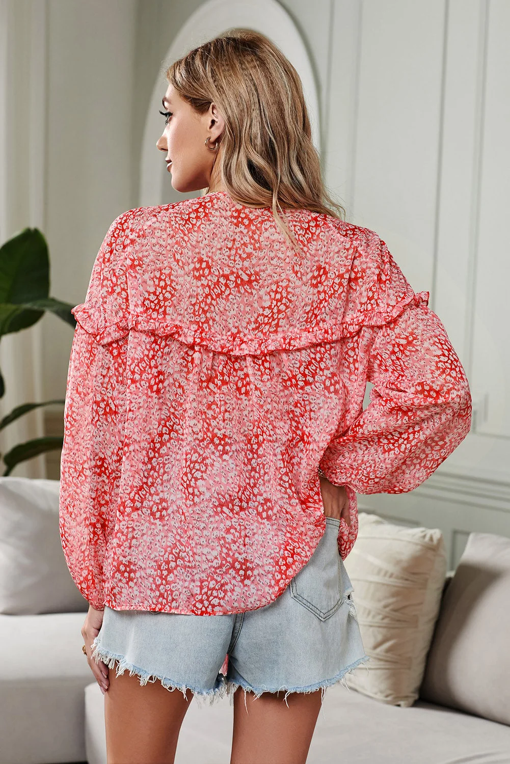 Women's Elegant Printed Ruffle V Neck Long Sleeve Blouse