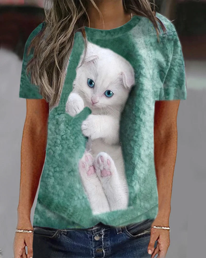 The standout feature of this T-shirt is its unique cat print that will steal the show wherever you go. The print is vibrant and eye-catching, making it a perfect addition to your wardrobe. Whether you're going for a casual look or dressing up for a night out, this T-shirt is perfect for any occasion.