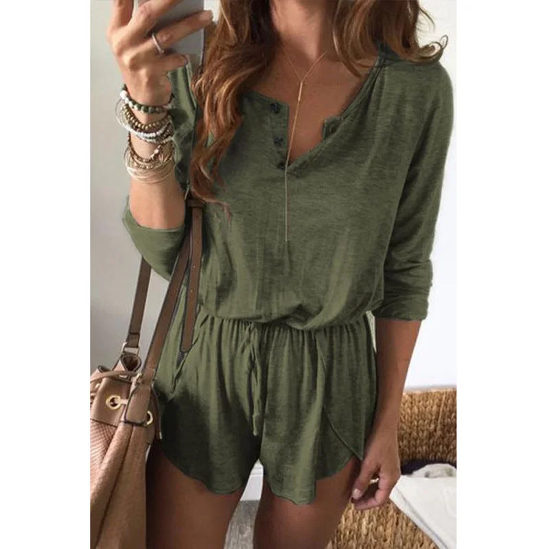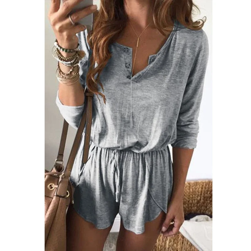 Women's Solid Color Lace-up Long-sleeved Shorts Jumpsuit